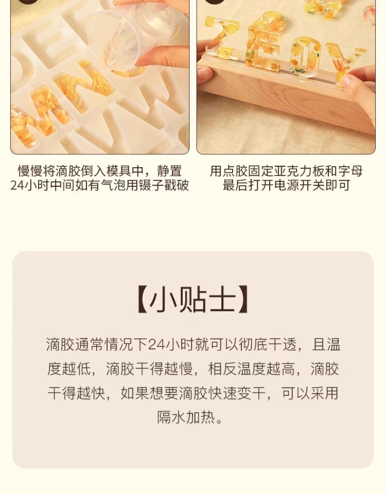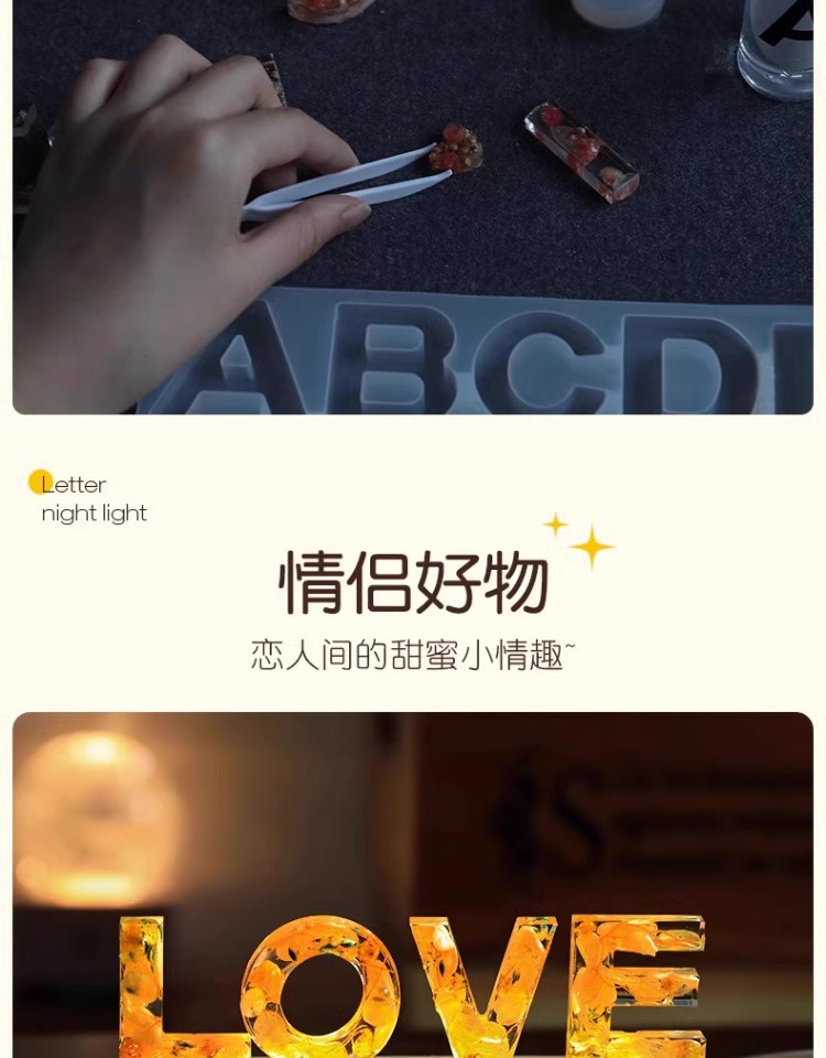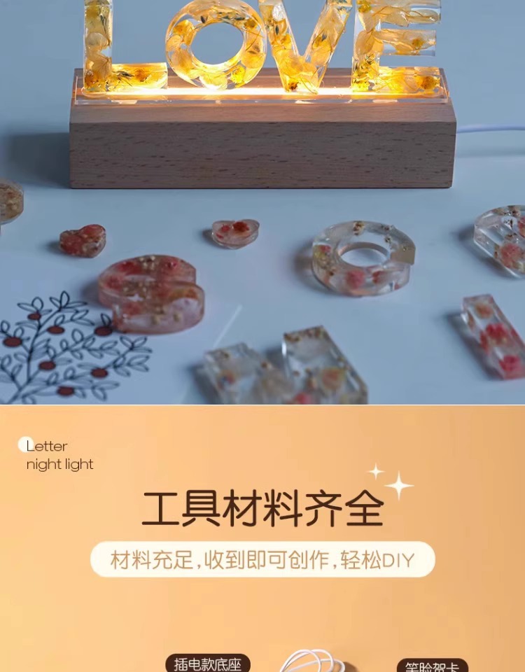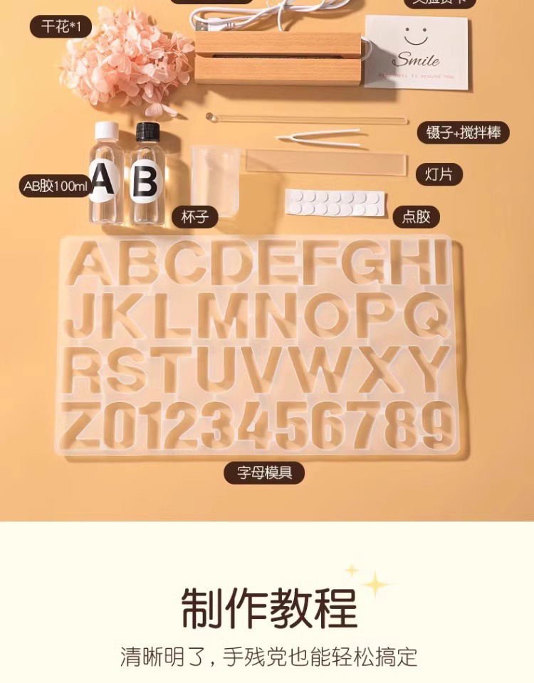 Lamp x1pc + Base x1pc + Dispensing x1bag + Glue x1pc + Tweezers x1pc + Stirring stick x1pc + Measuring cup x1pc + Mold x1pc